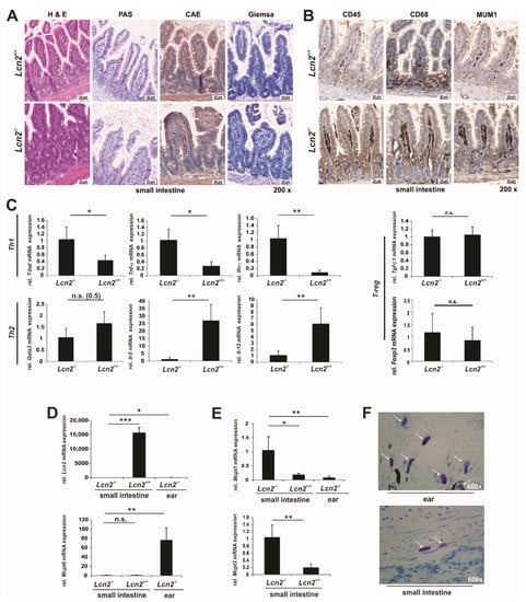 The staining in Figure 9A showed a higher cellularity in the villi of the Lcn2 null animals compared to the wild type counterparts. To further visualize if there was higher inflammatory activity in the small intestine, we comparatively immunostained tissue sections of both genotypes with antibodies specific for the leukocyte common antigen (CD45), the lymphocyte-specific transcription factor MUM-1 also known as multiple myeloma oncogene 1 or interferon regulatory factor 4 (IRF4), and monocyte lineage marker CD68 (Figure 9B). All three markers were significantly higher expressed in the villi of the small intestinal tract of Lcn2 null mice, indicating that the inflammatory activity was indeed significantly increased in the respective mice (Figure 9B). In a next step, we differentiated between the different CD4+ T-derived cells including Th1, Th2, Treg, and Th17 cells (Figure 9C, and below). The mRNA of the Th1 cell key transcription factor T-bet, in line with the cytokines Tnf-α and Ifn-γ, were elevated. In contrast, the mRNA encoding the transcription factor Gata3 showed a tendency to be reduced, whereas the Th2 corresponding cytokines Il-5 and Il-13 were significantly downregulated in Lcn2-deficient animals in comparison to controls (Figure 9C). The expression of the Treg relevant cytokine Tgf-β1 as well as the key transcription factor Foxp3 was not changed (Figure 9C). Due to the substantial changes in the bacterial colonization, mast cells as a professional defense mechanism of the innate immune response against bacteria were analyzed (Figure 9D–F). We included ear tissue of Lcn2 null mice in our analysis, which was tested to be negative for Lcn2 expression (Figure 9D, upper) and showed a high abundance of connective tissue mast cells (ctMC) when stained with Toluidine Blue (Figure 9F, left). The expression of tryptase (Mcpt6), indicative of ctMC, was markedly higher in ears compared to tissue of the distal ileum as evidenced in RT-qPCR, and the expression was not different between Lcn2 null mice and respective controls (Figure 9D, lower). Moreover, Toluidine Blue stain of the distal ileum revealed that MC were only present in the connective tissue but not in the mucosal layers (Figure 9F, right). However, the expression of chymases (Mcpt1, Mcpt2), indicative of mucosal MC (mMC) and expressed at low levels in ear tissue (Figure 9E, left), was significantly higher in the distal ileum, especially in the distal ileum of Lcn2 null mice compared to wild type animals (Figure 9E).