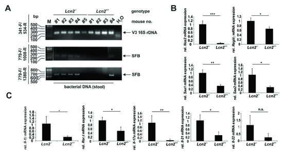 Proof and consequences of elevated quantities of segmented filamentous bacteria (SFB) in Lcn2-/- mice. (A) DNA was extracted from the distal ileal content of wild type and Lcn2-/- mice and analyzed by PCR for bacterial V3 16S- and SFB-specific 16S rRNAs. (B,C) Quantitative mRNA expression analysis of Nos2, RegIIIγ, Saa1, Saa2, Il-1β, Rorγt, Il-17a, Il-21, and Il-22 in the distal small intestine of wild type (Lcn2+/+) and Lcn2 null mice (each n = 4). Relative mRNA expression of respective genes was done by RT-qPCR and normalized to β-actin. Primers used are given in Supplementary Table S1. *: p < 0.05, **: p < 0.01, ***: p < 0.001.