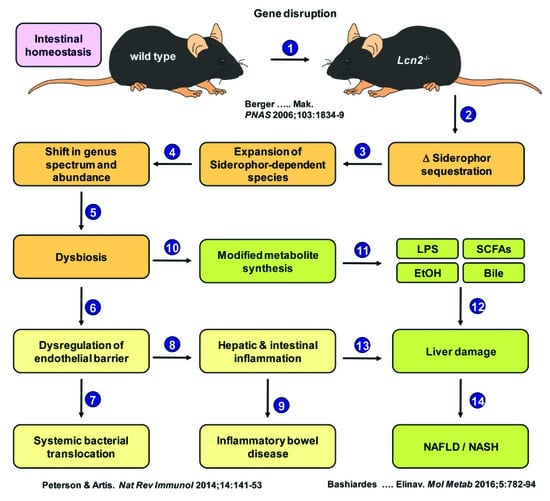 - Singh, V.; Yeoh, B.S.; Chassaing, B.; Zhang, B.; Saha, P.; Xiao, X.; Awasthi, D.; Shashidharamurthy, R.; Dikshit, M.; Gewirtz, A.; et al. Microbiota-inducible innate immune siderophore binding protein Lipocalin 2 is critical for intestinal homeostasis. Cell. Mol. Gastroenterol. Hepatol. 2016, 2, 482–498.e6. [Google Scholar] [CrossRef]