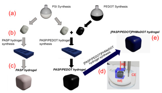Scheme showing the steps used to produce [PASP/PEDOT]PHMeDOT hydrogels: (a) synthesis of poly(succinimide) (PSI) and PEDOT particles; (b) the PSI was placed in a mold with and without the addition of PEDOT particles to cross-link and form the different hydrogels; (c) PASP and PASP/PEDOT hydrogels were obtained after the gelation stage; (d) PASP/PEDOT hydrogel was placed in a HMeDOT solution in order to form a PHMeDOT network by electropolymerization; (e) [PASP/PEDOT]PHMeDOT CPHs were obtained.