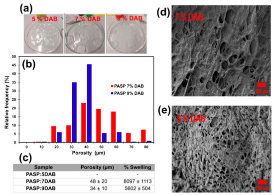 (a) Structural stability of cross-linked and swelled PASP hydrogels. (b) Pore size distribution histogram of PASP hydrogel synthesized by using different DAB percentages. (c) Overview of the porosity and swelling values for the different PASP hydrogels (standard deviation are also shown). Surface SEM images of (d) PASP:7DAB and (e) PASP:9DAB hydrogels. Micrographs recorded with 100× magnifications are displayed.
