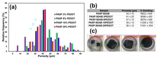 (a) Pore size distribution histogram of PASP/PEDOT hydrogels synthesized using different PEDOT percentages. (b) Overview of the porosity and swelling values (standard deviation is also shown). (c) Structural stability of cross-linked and swelled PASP/PEDOT hydrogels.