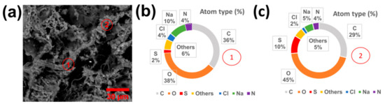 (a) Surface SEM micrograph of the PASP/PEDOT hydrogel. EDX analyses determined on (b) Point 1 (without PEDOT) and on (c) Point 2 (with PEDOT) of the sample displayed in (a).