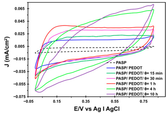 Electrochemical characterization by means of cyclic voltammetry allows us to relate the previous morphological study with the electrochemical activity of the generated CPHs. Figure 7 shows in a single graph the voltammogram registered for the second redox cycle of all the studied systems. A significant increase in current intensity was observed when the PEDOT MPs were incorporated, which was attributed to the excellent properties of this CP. Later, the interpenetration of PHMeDOT at different electrogeneration times gradually increased the current density. In addition, it is important to note that a change in the shape of the CVs profiles was appreciated at about θ = 4 h. The voltammograms obtained for CPHs prepared using θ < 4 h exhibit a typical capacitive shape, but after this threshold, the oxidation and reduction peaks appeared more pronounced due to the fact that the amount of PHMeDOT increased significantly. Indeed, the shape of the voltammograms recorded for systems prepared using θ ≥ 4 h resembles the records obtained with supercapacitors prepared with multilayer films of conductive polymers [38]. This suggests that the interpenetration of PHMeDOT is internally restructuring the hydrogel matrix, forming electrically active internal layers, alternating with non-active layers that act as a dielectric, and producing the effect of capacitors in series.