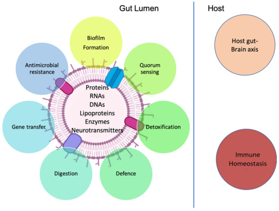 | Cargoes carrier | EVs released by Bacteroides fragilis include histamine and gamma-amino-butyric acid (GABA) as part of their content | [27] |