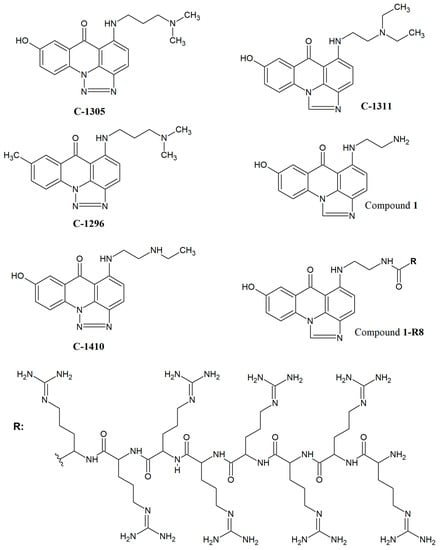 The second group of synthesized compounds, imidazoacridinone derivatives (C-1311 and Compound 1) presented in Figure 1 were synthesized, starting from 1-chloro-7-hydroxy-4-nitro-9(10H)-acridinone through to the substitution of aliphatic amines and reduction and cyclization of the resulting derivatives. This method of synthesis was described previously [,]. The strategy of the synthesis is presented in the Supplementary Materials in Figure S2. Compound 1 was used as a starting material for the synthesis of derivative Compound 1-R8.