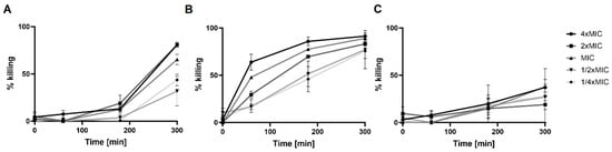 Killing kinetics analysis was performed as described previously []. Briefly, the suspensions of Candida albicans ATCC 10231 cells (500 μL) in RPMI 1640 at cell density of 104 cells mL−1 were added to 500 μL of RPMI 1640 medium with various concentrations of the compounds, corresponding to 8 × MIC, 4 × MIC, 2 × MIC, MIC, 1/2 × MIC, vigorously shaken, and then incubated at 37 °C for 60, 180 and 300 min. After an appropriate time of incubation, 10 μL was withdrawn and spread on YPG agar plates. The number of colony-forming units (CFUs) was determined after overnight incubation of the plates at 37 °C. The killing kinetics analysis was performed with the GraphPad Prism 8 software (GraphPad Software Inc., San Diego, CA, USA).