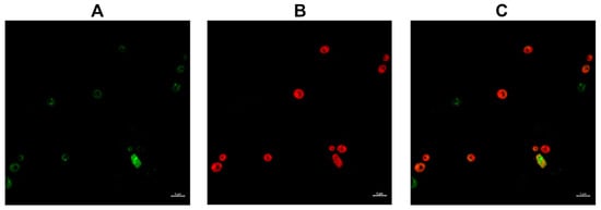 To better understand whether the killing activity of Compound 1-R8 may be associated with a change in the permeability of the cell membrane C. albicans ATCC 10231 cells were incubated with Compound 1-R8 (8 × MFC) for 1 h; then, fungal cells were subsequently incubated with 1 μg mL−1 propidium iodide (PI) for 30 min. Cells were harvested by centrifugation and washed twice with PBS. The fluorescent dye PI takes into account membrane permeability as a parameter to differentiate between live and dead cells []. Live cells are impermeable to PI, and hence an increase in PI staining suggests loss of viability associated with a change in the integrity of the cell membrane. Although recently published data suggested that, for S. cerevisiae cells, it is possible for PI-exposed yeast cells to be red but not dead, the subpopulation of cells exhibiting the ability to repair was estimated at approximately 7% []. It is still a well-established and rapid method for monitoring membrane damage. PI-negative and PI-positive cells were observed by confocal microscopy (Figure 4).