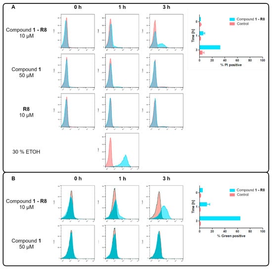 Representative flow cytometric analysis of C. albicans ATCC 10231 cells untreated (red) and treated (blue) with Compound 1-R8 at concentration corresponding to 1/2 × MFC (10 μM), Compound 1 (50 μM) for 0, 1, and 3 h and 30% EtOH for 1 h (positive control) in the presence of 1 μg mL−1 of PI (final concentration). (A) Red fluorescence of PI and (B) green fluorescence associated with the presence of an acridone fluorophore were analysed. Both fluorescence intensities are presented on a logarithmic scale.