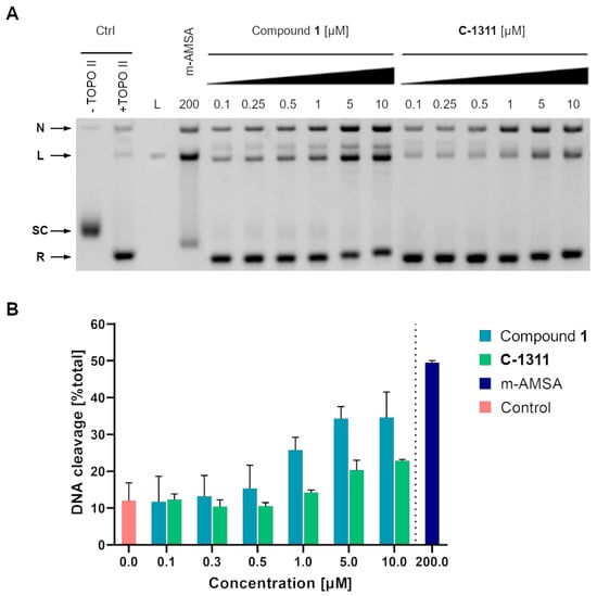 As indicated in Figure 7, Compound 1 as well as C-1311 stimulated the formation of DNA–yeast topoisomerase II cleavable complexes in vitro.