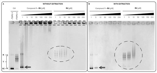 The effect of Compound 1-R8 and R8 on yTOPO II relaxation ability. Results of parallel electrophoretic separation of samples from one experiment without the extraction step (A) and with the extraction step (B). Weak DNA–peptide interactions are highlighted with a dotted rectangle. Strong DNA–peptide interactions are highlighted with a dotted ellipse. Supercoiled pBR322 plasmid DNA migration delay is marked with arrows. SC, supercoiled DNA; R, relaxed DNA; T, DNA topoisomers. Data shown are typical of three independent experiments.