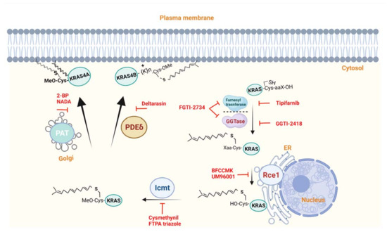 Overview of the post-translational modifications allowing membrane targeting of KRAS4A and KRAS4B and the enzymes involved in these modifications. Effective inhibitors of these enzymes are shown in red. For more details, see the text.