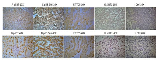 Example of the studied proteins staining in human lung cancer tissues. (A,B) positive staining of total p53 protein (p53T); (C,D) p53 phosphorylated at serine 46 (p53 S46); (E,F) TTC5 protein; and (I,J) SIRT1 at magnification 10× (A,C,E,G,I) and 40× (B,D,F,H,J). (I,J) is a control staining of lung cancer tissue with IgG antibody used as primary antibody. Scale bars indicate 250 µm for 10× and 62 µm for 40× magnification.