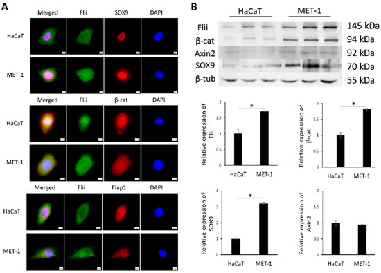 We first investigated the localization and expression of Flii, β-catenin, Axin2, Flap-1 and SOX9 in immortalized human keratinocytes (HaCaT) and tumorigenic MET-1 cell line established from a patient with late-stage aggressive metastatic cSCC [,]. Immunocytochemistry showed that Flii was observed in the nucleus and cytoplasm of both HaCaT and MET-1 cell lines (Figure 1A). Western blot analysis showed significantly higher Flii levels in a tumorigenic MET-1 cSCC cell line compared to HaCaTs (Figure 1B). Flii colocalized with nuclear SOX9 and both cytoplasmic and nuclear β-catenin in human cSCC cell line, suggesting involvement in Wnt/β-catenin signaling. No apparent difference in localization of β-catenin was observed between the two cell lines; however, like Flii, significantly higher levels of β-catenin were also observed in a MET-1 cSCC cell line (Figure 1A,B).