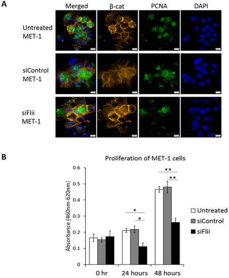 To determine the effect of Flii on proliferation, levels of proliferating cell nuclear antigen (PCNA) were assessed and compared to controls (Figure 3A). A clear reduction in PCNA was observed (Figure 3A,B). No apparent difference in expression of β-catenin levels was observed following Flii knockdown in a MET-1 cSCC cell line at this time point (48 h), despite an observed reduction in β-catenin level at 72 h (Figure 2A), suggesting a temporal effect. The functional consequence of Flii knockdown on proliferation of the MET-1 cSCC cell line was confirmed using a WST-1 proliferation assay, with significantly reduced proliferation (~50% reduction) of siFlii-MET-1 cells at both 24 and 48 h (Figure 3B).