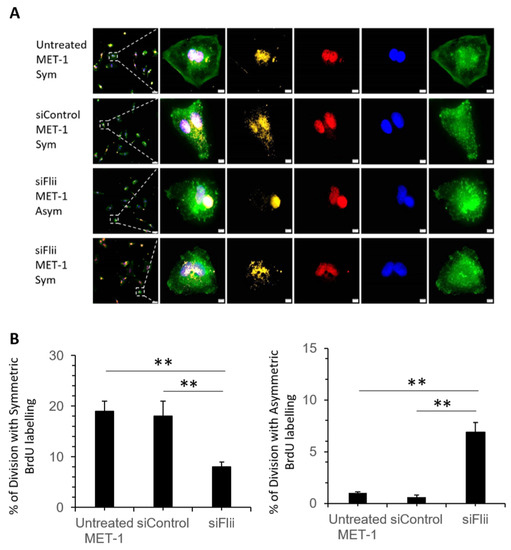Effect of Flii knockdown on cell division pattern of human cSCC cell line. (A) Representative images of MET-1 cells (untreated), siControl-MET-1, siFlii-MET-1 cells undergoing symmetric (Sym) or asymmetric (Asym) division following siRNA knockdown and BrdU-cytD pulse-chase labeling with a total time of 48 h. Triple immunofluorescent staining of BrdU (yellow) showing DNA synthesis in proliferating cell, pH3 (red) identifying mitotic chromosomes during metaphase of proliferation and phalloidin (green) identifying actin filaments and nuclear DAPI (blue) staining. Asymmetrically dividing cells show skewed inheritance of BrdU-labeled DNA at the end of metaphase and symmetrically dividing cells show equal inheritance of BrdU-labeled DNA at the end of metaphase. Arrest of cytokinesis by cytD is confirmed by phalloidin staining showing disrupted formation of actin filaments in granular shape. Scale bars, 5 μm. (B) Quantification of mitotic cells undergoing symmetric or asymmetric division following BrdU-labeling, illustrating a decreased symmetric division and increased asymmetric division following Flii knockdown. Data represent the mean from three independent experiments with an average of 30 mitotic events per group. Mean ± SEM. n = 30. ** p < 0.005.