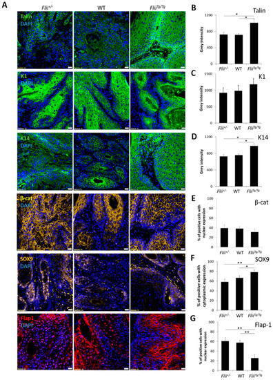 cSCC tumors in Flii+/−, wild-type and FliiTg/Tg mice were also examined for β-catenin, SOX9 and Flap-1 expression. While no difference was observed in expression levels of β-catenin, Flii overexpression resulted in significantly increased SOX9 levels in cSCC tumors of FliiTg/Tg mice compared to Flii+/− and wild-type counterparts (Figure 5A,E,F). SOX9 is a downstream effector of β-catenin activated transcription and a promoter of symmetric cell division during SCC metastasis []. FliiTg/Tg cSCC tumors also showed a significant decrease in Flap-1 expression (Figure 5A,G). This suggests a possible interplay between Flii and Flap-1 during cSCC development, as Flap-1 is a naturally occurring antagonist of Flii previously shown to promote asymmetric cancer cell division [] and regulate epithelial–mesenchymal transition in aggressive metastatic cSCC [].