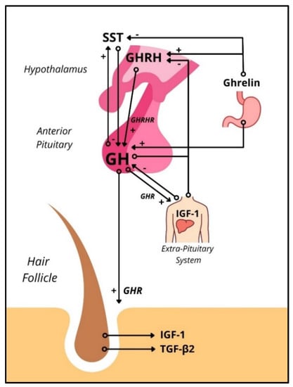 The somatotrophic axis is closely linked to sleep and the circadian rhythm. GHRH has sleep-promoting effects, and GH secretion occurs in a pulsatile fashion, with maximal levels occurring after the onset of slow-wave sleep. Abnormal circadian rhythm disorders like narcolepsy are associated with abnormalities in the HPS axis []. Interestingly, the HF demonstrates circadian-dependent clock gene activity in the absence of central clock influences ex vivo []. PER-1 and BMAL-1 were both shown to regulate human HF cycling, as well as melanogenesis []. The peripheral clock activity has also been shown to be modulated by neurohormones like thyroxine [], suggesting that other neurohormones like GH may also modulate HF biology directly or indirectly via modulation of clock genes. GH serum levels correlate with serum estradiol levels, with higher concentrations found in young people when compared with older people, as well as in females when compared to males. The bulk of GH secretion in males occurs during the night, whereas in females, nighttime secretion of GH corresponds to a smaller fraction of total daily GH secretion [], which confirms that GH and clock genes are in direct connection.