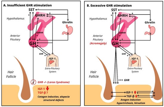 Impact of excessive and insufficient GHR stimulation on human scalp HFs: (A) HPS axis in the case of absent GH signaling, like Laron’s syndrome, leading to almost absent levels of IGF-1 due to absent GHR stimulation. Clinical findings include alopecia, frontal hairline recession, and structural defects. (B) HPS axis in the case of GH excess, like acromegaly, which upregulates both IGF-1, an anagen promoter, and TGF-β, a catagen promoter. Clinically, acromegaly patients show increased hair growth and hirsutism.