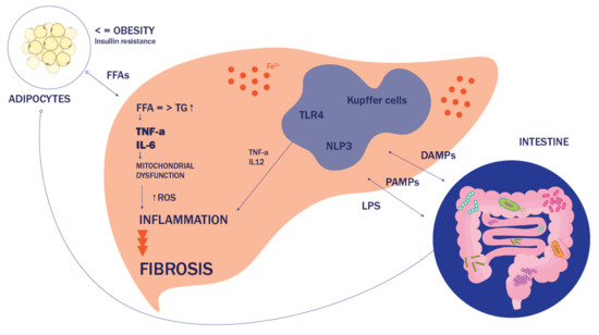- Tilg, H.; Moschen, A.R. Evolution of inflammation in nonalcoholic fatty liver disease: The multiple parallel hits hypothesis. Hepatology 2010, 52, 1836–1846. [Google Scholar] [CrossRef] [PubMed]