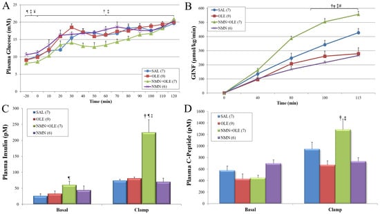 (A) Plasma glucose levels in mice infused intravenously with 37.5% glucose during hyperglycemic clamp. (B) Glucose infusion rate (GINF) required to obtain and maintain hyperglycemia. (C) Plasma insulin levels and (D) Plasma C-peptide levels prior to intravenous glucose infusion (basal period) and during the last 30 min of the clamp. C57BL/6J mice were intravenously infused for 48 h with SAL, OLE (0.4 μmol/min), NMN (0.025 mg·kg−1·min−1) + OLE, or NMN alone. These infusions were maintained during the hyperglycemic clamp. Data are means ± SE. Number in parentheses represents number of animals. * p < 0.05, SAL vs. OLE; ¶ p < 0.05, SAL vs. NMN + OLE; # p < 0.05, SAL vs. NMN; † p < 0.05, OLE vs. NMN + OLE; ‡ p < 0.05, NMN + OLE vs. NMN; ¥ p < 0.05, OLE vs. NMN.