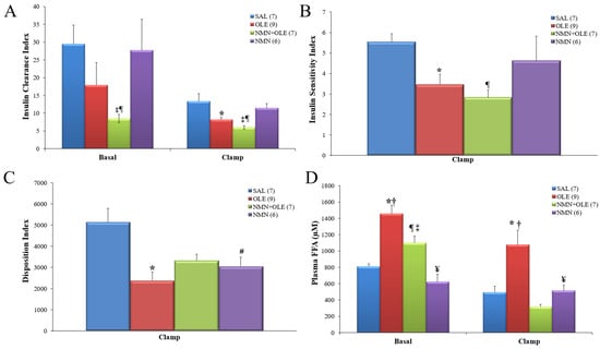 (A) Insulin Clearance Index (steady-state C-peptide/insulin molar ratio) prior to intravenous glucose infusion (basal period) and during the last 30 min of the clamp. (B) Insulin Sensitivity Index (M/I, µmol·kg−1·min−1 glucose infusion per pM insulin) and (C) Disposition Index (units = C-peptide in pM multiplied by SI) during the last 30 min of the clamp. (D) Plasma FFA levels during the basal period and during the last 30 min of the clamp. C57BL/6J mice were intravenously infused for 48 h with SAL, OLE (0.4 μmol/min), NMN (0.025 mg·kg−1·min−1) + OLE, or NMN alone. These infusions were maintained during hyperglycemic clamps. Data are means ± SE. Number in parentheses represents number of animals. * p < 0.05, SAL vs. OLE; ¶ p < 0.05, SAL vs. NMN + OLE; # p < 0.05, SAL vs. NMN; † p < 0.05, OLE vs. NMN + OLE; ‡ p < 0.05, NMN + OLE vs. NMN; ¥ p < 0.05, OLE vs. NMN.