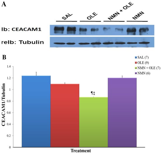 Western Blot analysis of hepatic CEACAM1 protein levels. Mice were infused for 48 h with SAL, OLE, NMN + OLE, or NMN before livers were extracted and 7 µg of protein lysates were analyzed by 7% SDS-PAGE followed by immunoblotting (Ib) the upper half of the membrane with a polyclonal antibody against α-CEACAM1 (1:500, Ab-2457) and the lower half with a monoclonal antibody against Tubulin (as a loading control). (A) A representative blot is shown. (B) Protein band density was quantified using Image J. Data are means ± SE. Number in parentheses represents number of animals. ¶ p < 0.05, SAL vs. NMN + OLE; ‡ p < 0.05, NMN + OLE vs. NMN.