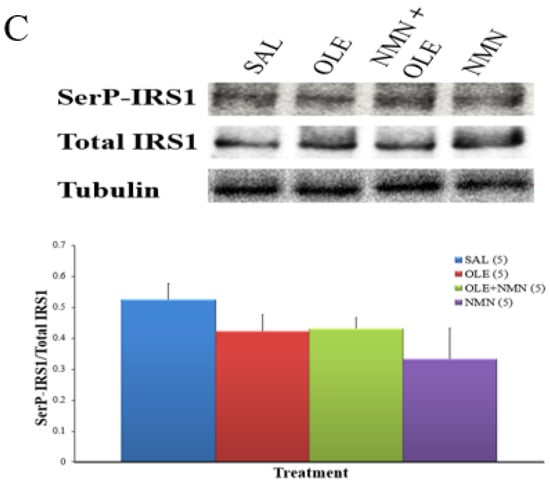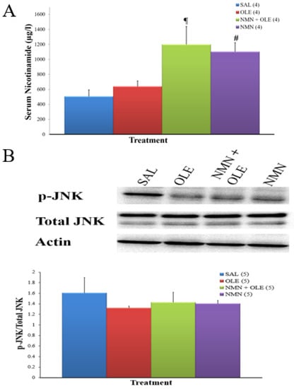 (A) Serum nicotinamide levels in mice after 48 h infusion. C57BL/6J mice were intravenously infused for 48 h with SAL, OLE (0.4 μmol/min), NMN (0.025 mg·kg−1·min−1) + OLE, or NMN alone. Data are means ± SE. Number in parentheses represents number of animals. ¶ p < 0.05, SAL vs. NMN + OLE; # p < 0.05, SAL vs. NMN. Western Blot analysis of: (B) JNK phosphorylation and (C) IRS serine 307 phosphorylation in the livers of mice treated as described in Figure 4a.