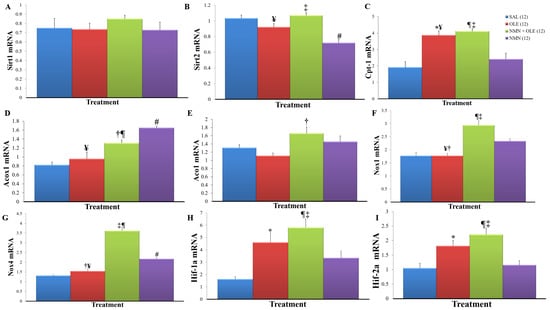 Hepatic mRNA levels after 48 h infusion. Liver lysates (n ≥ 6 mice/treatment) underwent qPCR analysis of mRNA in replicate and normalized against 18S. (A) Sirt1 mRNA levels (B) Sirt2 mRNA levels (C) Cpt-1 mRNA levels (D) Acox1 mRNA levels (E) Aco1 mRNA levels (F) Nox1 mRNA levels (G) Nox4 mRNA levels (H) Hif-1a mRNA levels (I) Hif-2a mRNA levels. Data are means ± SE. Number in parentheses represents number of animals. * p < 0.05, SAL vs. OLE; ¶ p < 0.05, SAL vs. NMN + OLE; # p < 0.05, SAL vs. NMN; † p < 0.05, OLE vs. NMN + OLE; ‡ p < 0.05, NMN + OLE vs. NMN; ¥ p < 0.05, OLE vs. NMN.