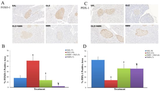 FOXO-1 and PDX-1 protein expression in pancreatic islets. Representative images of immunohistochemical staining of FOXO-1 (A) and PDX-1 (C) in pancreatic islets of mice treated with SAL, OLE, NMN + OLE, or NMN alone. (B,D) Quantification of FOXO-1 and PDX-1 positive area over total area of pancreatic islets. Data are means ± SE. Number in parentheses represents number of animals. * p < 0.05, SAL vs. OLE; † p < 0.05, OLE vs. NMN + OLE; ¥ p < 0.05, OLE vs. NMN.