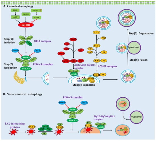 Canonical autophagy is initiated by various cellular stresses and can be roughly divided into five steps: (1) initiation, (2) nucleation, (3) expansion, (4) fusion, (5) degradation. It is controlled by Atg family proteins, kinases, and lipid metabolism (Figure 2). The initiation step is triggered by inhibiting mechanistic target of rapamycin kinase (mTOR) or activating AMP-activated protein kinase (AMPK), leading to the assembly and activation of the ULK1 complex including ULK1, Atg13, Atg101, and FIP200 [24,25,26]. The step of nucleation requires the ULK1 complex to phosphorylate the class III PI3KC3 complex which consists of the tumor suppressor Beclin-1, Beclin-1-regulated autophagy protein 1 (AMBRA1), the lipid kinase VPS34, the scaffolding protein VPS15, and the autophagy-specific subunit Atg14 [27]. The ATG12–ATG5–ATG16L1 complex and LC3–phosphatidylethanolamine (PE) are necessary for promoting the expansion of the phagophore membrane [28]. After autophagosome formation, autophagosomes undergo a stepwise maturation process including fusion events with multivesicular endosomes and lysosomes. Fusion with lysosomes is necessary for the complete degradation of the segregated cytoplasm [29].
