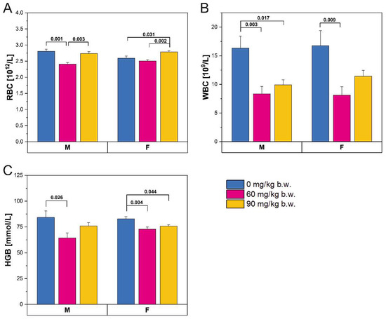Red blood cell (RBC) count (A), white blood cell (WBC) count (B), and hemoglobin (HGB) concentration (C) in male (M) and female (F) newborn rats prenatally exposed to fumonisins. Data are given as mean ± standard error. M, male; F, female.