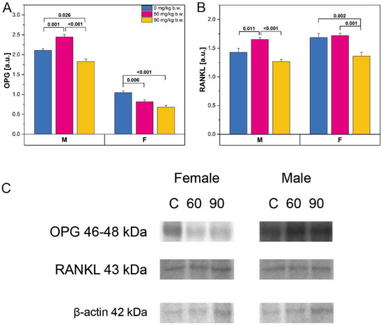 The Western-blot protein expression of (A): osteoprotegerin (OPG) and (B): RANKL from the whole bone of male and female newborn rats prenatally exposed to fumonisins. The relative abundance of OPG and RANKL was evaluated densitometrically and expressed as the ratio relative to β-actin; (C): representative Western blots of examined proteins in femora obtained from male and female newborn rats prenatally exposed to 0, 60, or 90 mg/kg b.w. FBs. Data are presented as mean ± standard error. M, male; F, female. Original Western blot membranes are presented in Supplementary Material, Figure S1.