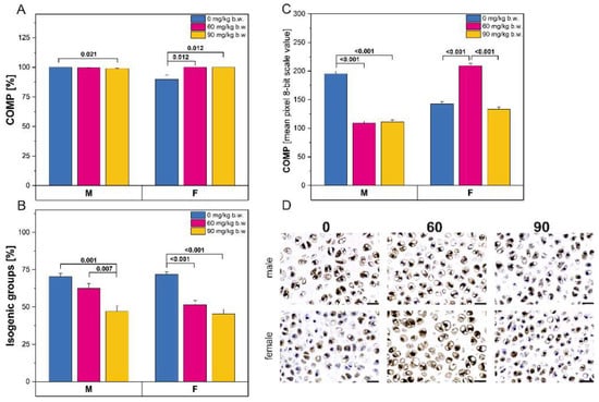 Following FBs intoxication, both the percentage of cells with a positive reaction (Figure 6A) and the intensity of the immunostaining reaction for cartilage oligomeric matrix protein (COMP; Figure 6C) were significantly decreased in male rats. Female rats displayed a significantly increased percentage of COMP-positive cells following consumption of FBs, regardless of dose. The intensity of the COMP immunostaining was only significantly increased compared to control rats in the rats in the 60 mg/kg b.w. FBs’ group. Interestingly, a decrease in the number of isogenic groups was observed following FBs intoxication for both sexes (Figure 6B).