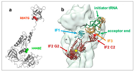 Location of the amino acid substitutions within the IF2 molecule. (a) Location of the His448 (green) mutation in the G2 domain and the Arg847 mutation (red) in the C2 domain of E. coli IF2. Because the C2 domain was not visible in the X-ray structure of bacterial IF2 [3,24], the positions of these amino acids are shown within the 3D structure of aIF5B, the archaeal IF2 homologue of IF2 [34]; (b) location of His 448 (yellow star) and Arg847 (red star) in the IF2 molecule (brown) within a 30S initiation complex with respect to the location of the acceptor end of initiator tRNA (green) and of initiation factors IF1 (cyan) and IF3 (orange). The positions of the 30S (gray) ligands are derived from cryo-EM reconstitutions [14].