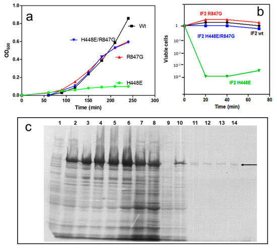 An additional test was carried out to ascertain that the product synthesized in the presence of the IF2 mutants does not consist of random amino acids incorporated into an acid insoluble product but represents instead a faithful translation of the mRNA-encoded protein. For this purpose, protein synthesis tests were repeated using cell free systems programmed with an mRNA encoding a natural protein, namely the C domain of IF2, whose in vitro product can be detected and quantified immunologically [45]. The results of these experiments confirmed that mRNA translation can occur in the presence of the IF2 factors carrying the R847G mutation and that translation faithfully yields a product recognized by monoclonal antibodies directed against the protein encoded by the mRNA used to program the synthesis (Figure 8c). As in the previous case (Figure 8a,b), no synthesis occurred in the presence of the IF2 molecule carrying a single mutation of the His448 residue, but a sizable level of translation occurred when also a second mutation of R847 was present.