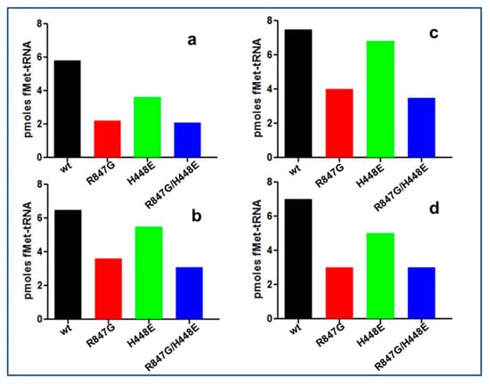 In agreement with published data [38,39], the IF2 H448E proved to be totally inactive in ribosome-dependent GTP hydrolysis; the doubly mutated IF2 H448E/R847G factor was also inactive in GTP hydrolysis, suggesting that the suppression of the dominant lethal phenotype is not due to the restoration of the GTPase activity of IF2. By contrast, IF2 R847G had wild type activity in GTP hydrolysis (Figure 3).