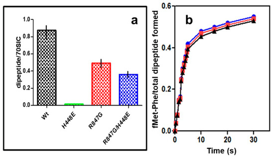 The successful suppression of lethality does not tell us anything about the activity of the doubly mutated IF2 which lacks GTPase activity. Therefore, the capacity of the IF2 mutants to support maturation of the 70S IC into a productive 70S EC was assessed by measuring their capacity to promote formation of the first peptide bond between P-site bound fMet-tRNA and the first incoming aminoacyl-tRNA bound to the ribosomal A site in response to the second mRNA codon. In Figure 7a, the level of the fMet-Phe “initiation dipeptide” formed in the presence of the mutant IF2 molecules is expressed as percent of the fMet-tRNA molecules present in the 70S IC, which is about 40% the level obtained with IF2 wt, as seen in Figure 5b. In addition, in the cases of 70S ICs formed in the presence of IF2 R847G and IF2 H448E/R847G, the efficiency by which the 70S-bound fMet-tRNA participates in “initiation dipeptide” formation is only 40–50% compared to IF2 wt (Figure 7a). Thus, the overall level of “initiation dipeptide” formed in the presence of the IF2 mutants bearing the R847G substitution is much lower compared to the level obtained with IF2 wt. Nevertheless, a substantial amount of the fMet-Phe “initiation dipeptide” is formed also in the presence of IF2 R847G and IF2 H448E/R847G, whereas IF2 H448E was completely inactive (Figure 7a). Furthermore, the kinetics at which the “initiation dipeptide” formation approaches completion (i.e., the level attained after 15 min incubation) are indistinguishable for 70S IC containing IF2 wt or IF2 mutants bearing the R847G substitution with a kapp = 0.45 ± 0.05 (Figure 7b) for everyone of them.