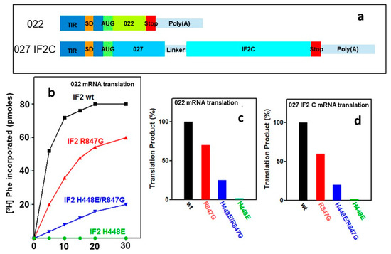 mRNA translation in the presence of IF2 wt and IF2 mutants. (a) Schematic representation of the mRNAs used in the translation tests. The corresponding sequences are reported in Supplementary Materials (Figure S3a,b). Translation of mRNA in cell free systems containing IF2 wt (black), IF2 R847G (red), IF2 H448E/R847G (blue), and IF2 H448E (green); (b) Time course of [3H] phenylalanine incorporation into acid-insoluble product under the direction of model 022mRNA [45]. The incubation was carried out at 37 °C for the indicated times or for 45 min (panel (c)); (d) the level of 027IF2C mRNA translational was quantified by ELISA using monoclonal antibodies directed against IF2C, as described [45]. In panels (c,d), the translational level obtained in the presence of the IF2 mutants is expressed as % of the level obtained with IF2 wt. No detectable translation was observed in the absence of IF2.