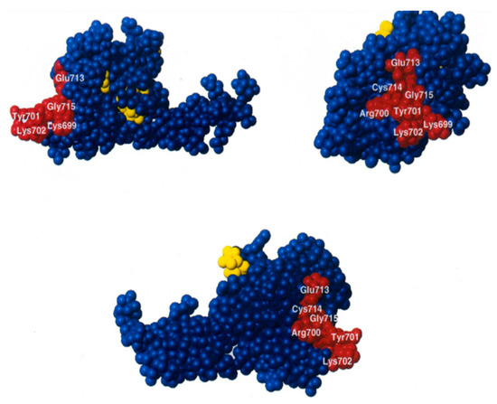 Location of the amino acid residues essential (red) and non-essential (yellow) for the IF2-fMet-tRNA interaction identified by mutagenesis shown within different views the 3D structure of G. stearothermophilus IF2 C2 (blue) determined by NMR spectroscopy [46]. Arg700 corresponds to E. coli Arg847. Figure taken from [43].