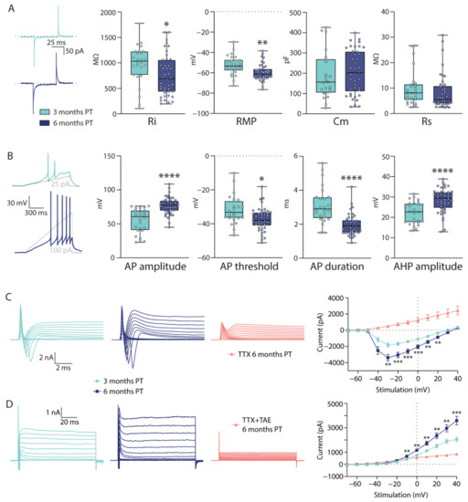 Estimated resting membrane potential (RMP), series resistance (Rs), input resistance (Ri), and cell membrane capacitance (Cm) were calculated from a series of 5 mV pulses of 100 ms duration, applied through the patch pipette immediately after whole-cell configuration was established. The membrane capacitance was calculated from the charge integration of the transient response to the test pulse. To determine the ability to fire action potentials (APs), 500 ms current steps ranging from −40 pA to 200 pA in 10 pA steps were applied while holding the cell membrane potential at approximately −70 mV. From the same holding potential, 1-s linear ramp currents were injected into the cells to determine the AP threshold. AP amplitude was measured from threshold to peak, and duration was measured as the width at the threshold. The amplitude of the afterhyperpolarization (AHP) was measured as the difference between the AHP peak and the AP threshold. Sodium and potassium currents were evoked by a series of 100 ms long voltage steps ranging from −90 mV to +40 mV in 10 mV steps. In addition, their sensitivity to 1 µM tetrodotoxin (TTX, Abcam, Cambridge, UK) and 10 mM tetraethylammonium (TEA, Abcam, Cambridge, UK) was assessed.