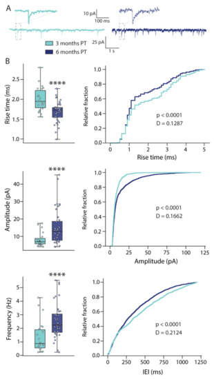 44]. A postsynaptic current template was generated from the voltage-clamp recordings which were low-pass filtered at 400 Hz and was used for the detection algorithm. Events with a correlation coefficient to the template lower than 0.6 were excluded from the analysis, as well as those with amplitude <3 pA and rise-time >5 ms. For distribution comparisons, an equal number of events was analysed from all recorded neurons, while for median comparisons all events were considered.