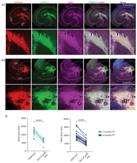 For all quantifications ImageJ software (NIH, Annapolis, MD, USA) was used. For quantification of GABA immunostaining, mean fluorescence intensity was measured in confocal Z-stack images taken at 20× magnification using maximal intensity projection from 13 stacks (1 µm distance). In each slice, the area of the graft was outlined based on the STEM121 immunostaining, and the median grey value was measured in the GABA-staining channel. Together with the graft area, an area outside of the graft was outlined and fluorescence intensity was measured. The two values in each slice were then compared. For quantification of CR and CB stainings, similar Z-stack images were composed. Firstly, all cells positive for the human cytoplasm marker (STEM121+ cells) were counted, and Hoechst was used to visualise the nuclei and identify individual cells. Secondly, cells double positive for STEM121 and CB or CR, respectively, were counted. A percentage of double-positive cells out of all STEM121+ cells was calculated for each slice and used for statistical analyses.