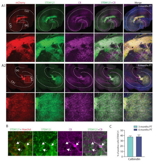 Apart from the GABAergic phenotype of the grafted cells assessed by electrophysiology and immunohistochemistry, the predominant subtypes of the grafted hdInts were consistent with those expressing CR and CB as was also the case in our in vitro study [
