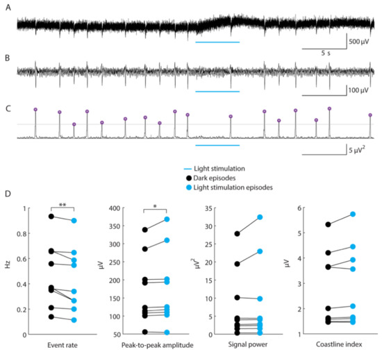 We analysed the frequency of occurrence of the events and, using the filtered signal, we computed 3 parameters for each event: peak-to-peak amplitude, peak signal power, and coastline index according to the formula: , where y is the filtered signal, N is the number of samples and n is the index of the sample. For the statistical analysis, the mean of these parameters was computed for the dark period and light stimulation period in each of the 30 runs of the given protocol in the given slice. Then, the runs were averaged and the resulting two numbers per slice (dark and light) were subtracted. The differences were then evaluated by Wilcoxon signed-rank test.