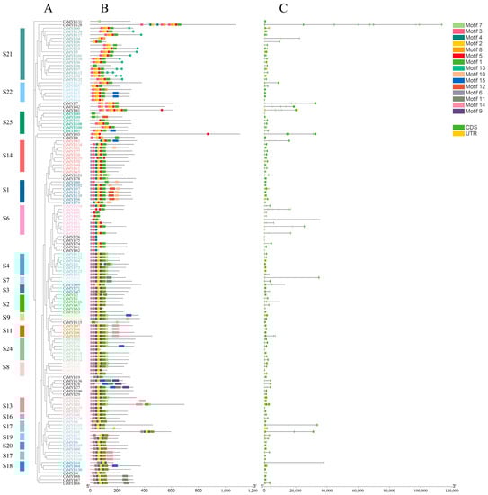 Phylogenetic relationship, conserved protein motif, and gene structure analysis of CeMYBs. (A) A phylogenetic tree harboring 136 CeMYBs. S1~S25 represent subfamilies. (B) Conserved motifs in CeMYBs of different subfamilies. The colored boxes represent the conserved motifs listed on the right side of the figure. Black lines indicate non-conserved sequences. (C) Gene structure of CeMYBs. Green boxes represent exons, black lines connecting two exons represent introns, and yellow boxes represent untranslated regions.