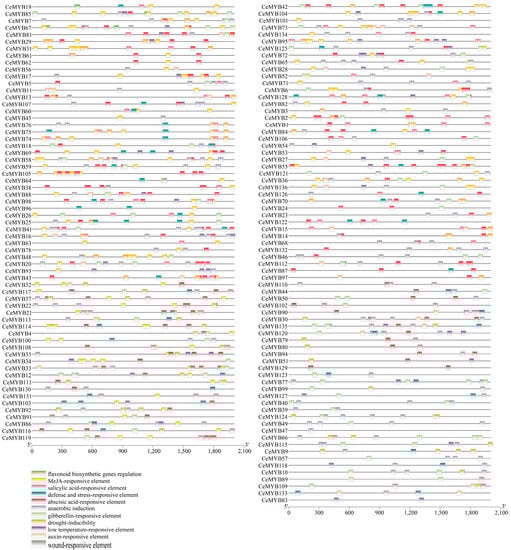 Regulatory elements in the promoter region of CeMYBs as predicted with PlantCARE. Cis-acting elements with similar functions were displayed in the same color. Different colored boxes represent different cis-acting elements.