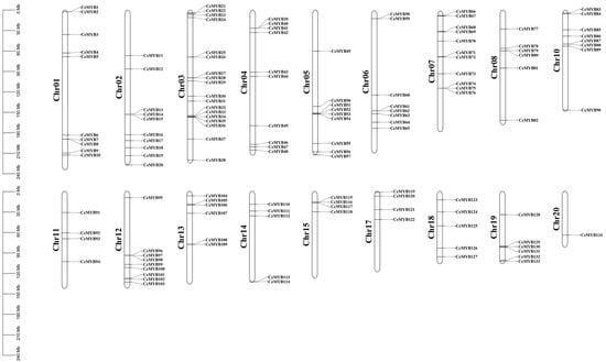 Chromosomal localization analysis of the CeMYBs. The chromosome number is indicated to the left of each chromosome. The scale is in mega bases (Mb). Each gene is named according to the order of its corresponding location on the chromosome.