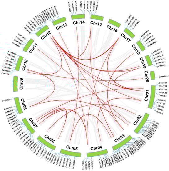 Synteny analysis of CeMYBs in C. ensifolium. Red lines represent the duplicated CeMYB gene pairs in the genome. The chromosome number is displayed next to each chromosome.
