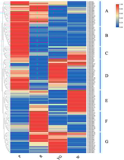 Expression patterns of 108 CeMYBs categorized into seven groups (A–G) according to the expression levels in different sepals. P: purple-red sepals; R: red sepals; YG: yellow-green sepals; W: white sepals.